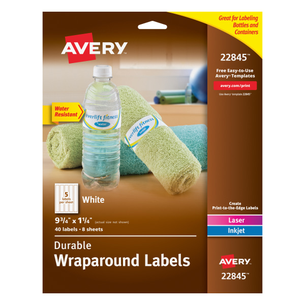 Avery® 1-1/4" x 9-3/4” Waterproof Wraparound Rectangle Labels with Sure Feed™, 40 Labels, Permanent, Matte White (22845)